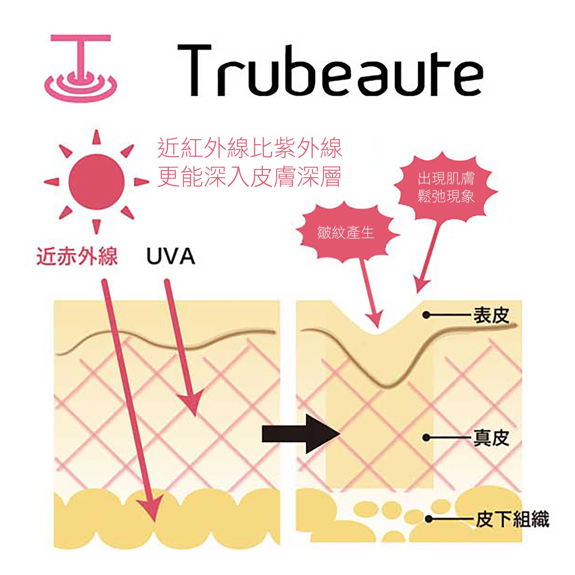 近紅外線的波長比紫外線更長,能更深入地滲透進皮膚組織。造成皺紋與鬆弛的最主要原因,被認為就是「太陽光」。其中,紫外線中的 UV-B 可達到角質層與表皮淺層,是色斑與雀斑的主因;而 UV-A 則能深入至真皮層,破壞支撐肌膚彈性的膠原蛋白與彈力蛋白,進一步導致皺紋與色素沉澱。