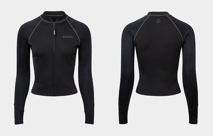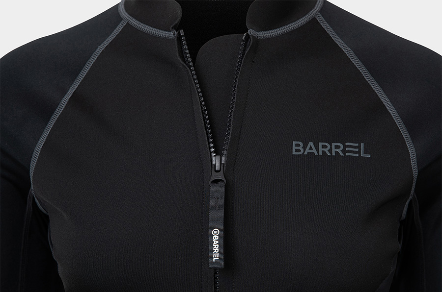 這款拉鍊式混合防寒衣,在身體部位採用輕量且高彈性的 1mm 氯丁橡膠材質,兼具保暖性與靈活度。腰線剪裁設計能修飾身形,展現俐落的修長輪廓。