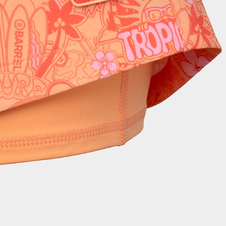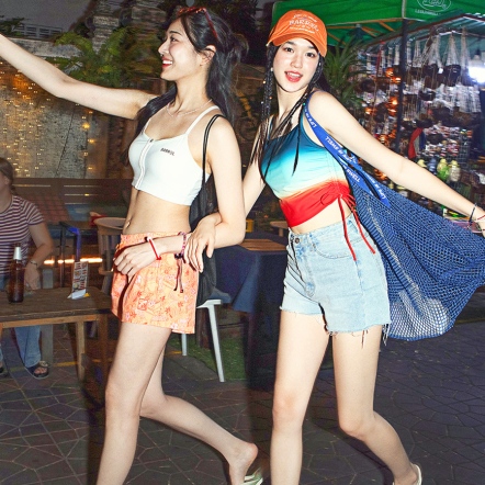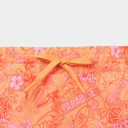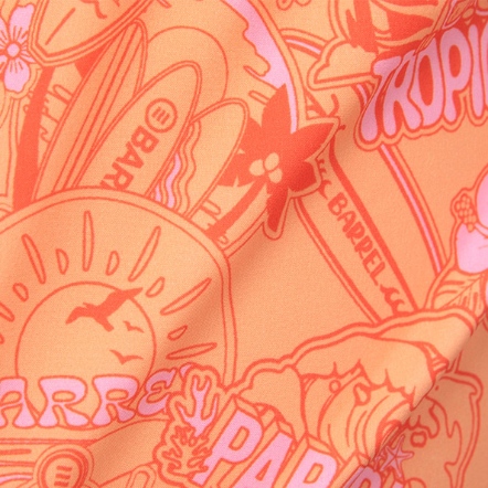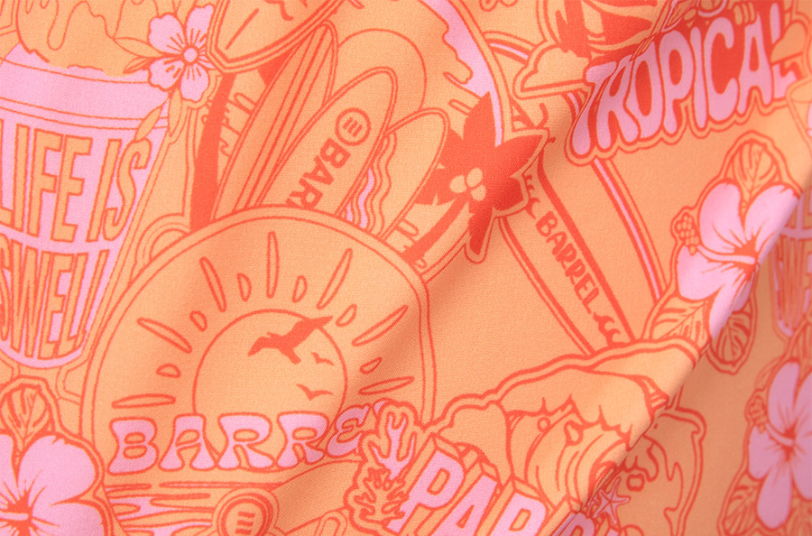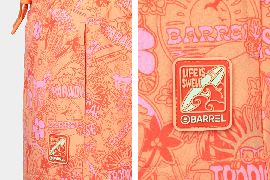 整體以熱帶風格印花圖案展現清新悠閒的度假氛圍,並搭配品牌徽章刺繡細節增添整體造型亮點。