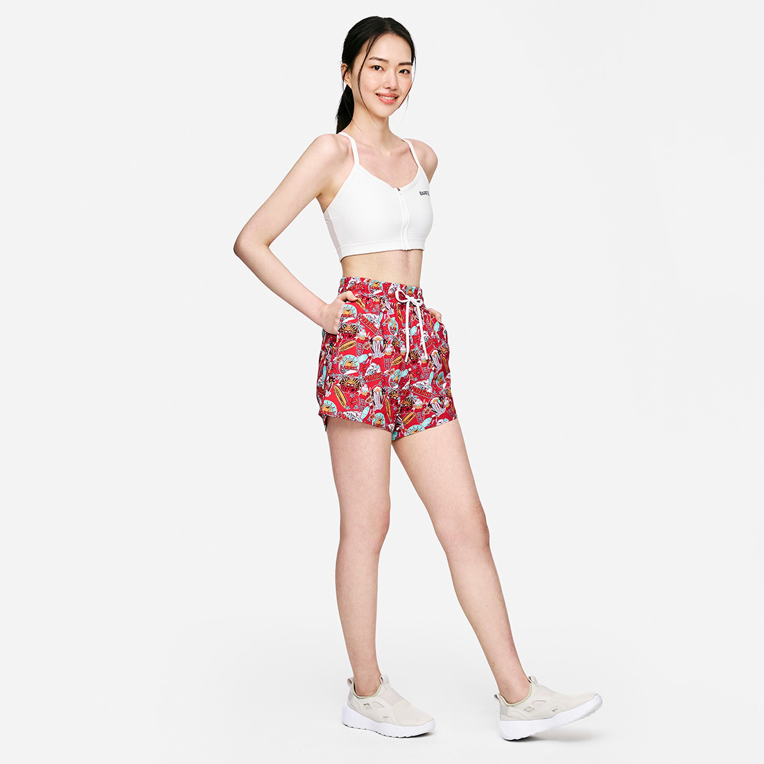 此款為三分長度的水陸兩用短褲,設計以寬版高腰彈性腰頭,能自然修飾腰身,穿出俐落修身剪裁效果。