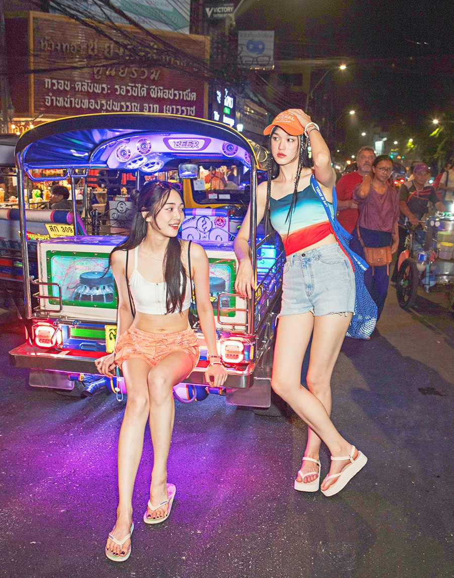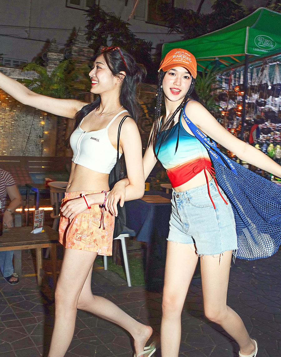 後背印有品牌圖騰標誌,增添設計亮點與熱帶度假風情。