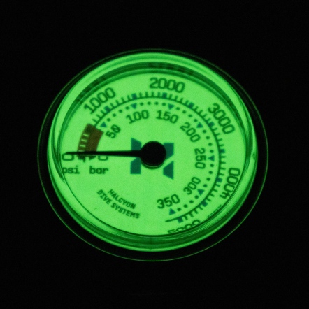 錶面同時顯示 psi 與 bar,讓使用不同單位的潛水團隊也能輕鬆應用。螢光錶面即使在低光環境下也能清晰讀值。