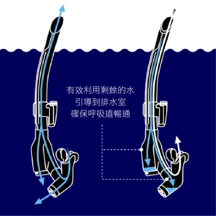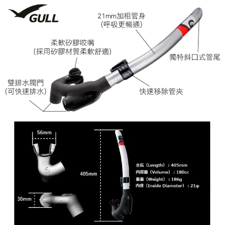 半乾式:半乾式管尾呼吸管採用21mm大口徑管路,呼吸順暢。