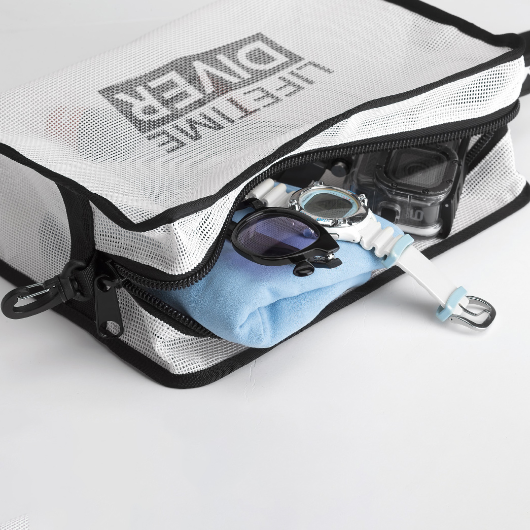 採用PVC橡膠塗層網格設計不但防水,還很透氣,特別適合收納各種小物件、或其他濕答答的濕毛巾、相機、潛水裝備等小物...等。