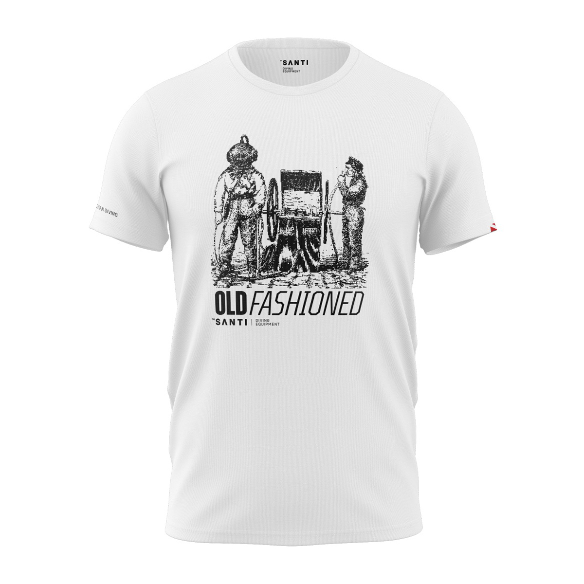 這款白色 T-Shirt 正面印有復古潛水員圖案和 Santi 標誌,簡單又具有復古感。