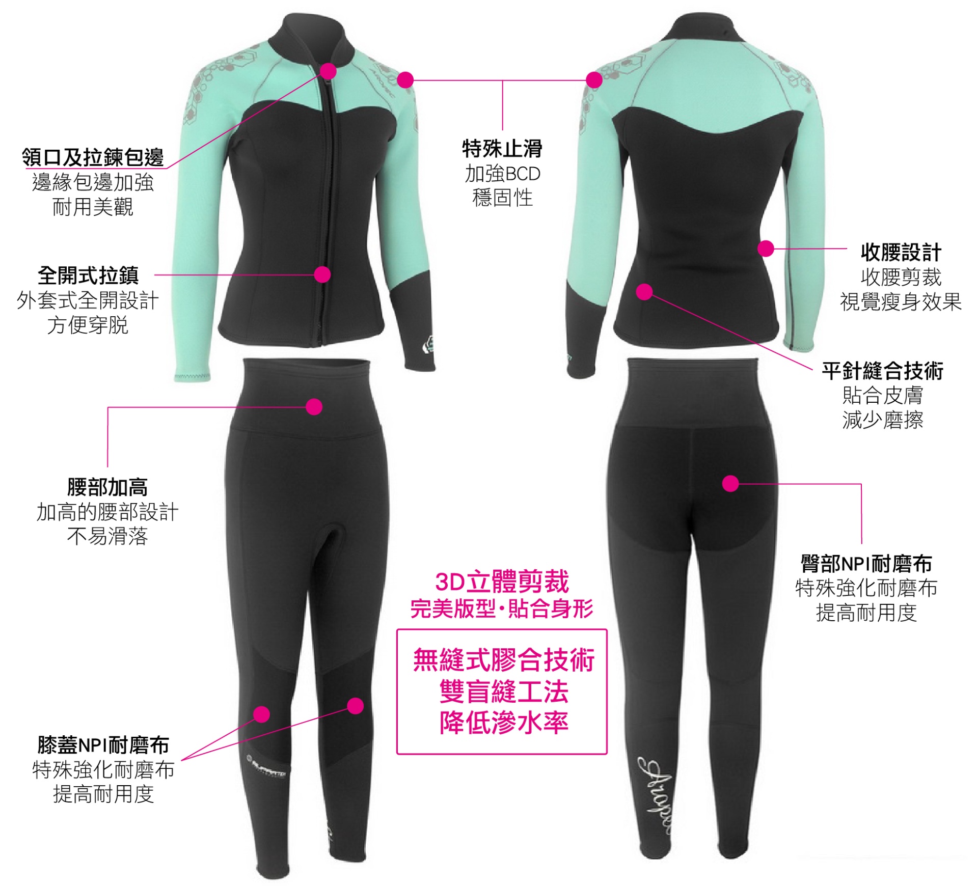 這款女兩件式長袖長褲防寒衣,以柔軟舒適的Neoprene保暖材質結合NPI耐磨布製作,並具有九大產品特色:全開式拉鍊、特殊止滑、臀部耐磨布、膝蓋耐磨布、腰部加高、領口/拉鍊包邊、收腰設計、平針縫合技術、肩膀釋壓設計。