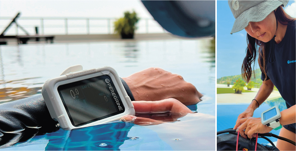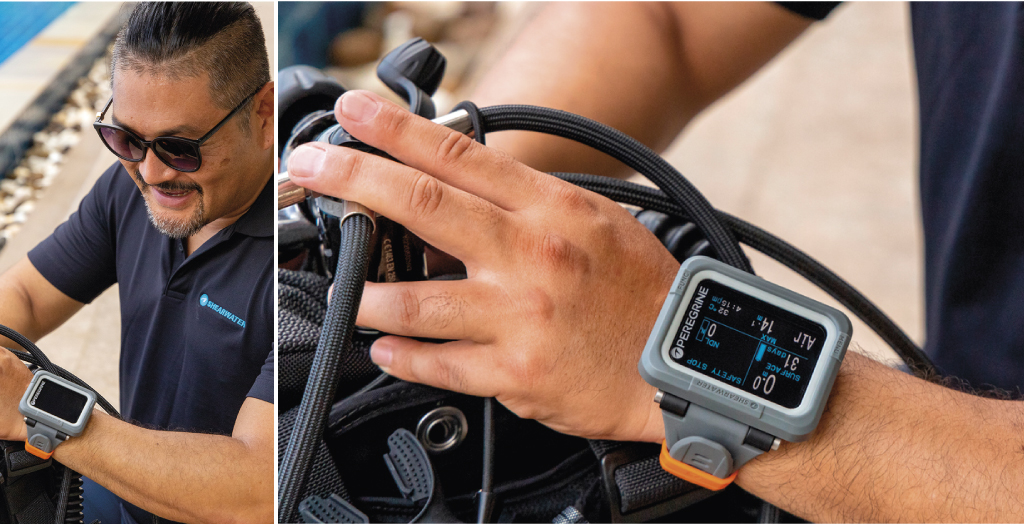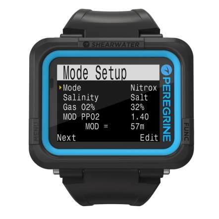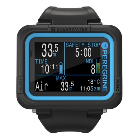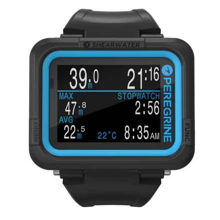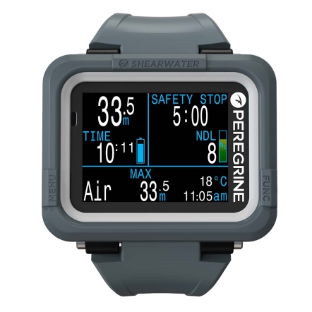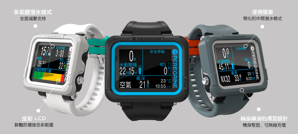 在Shearwater的陪伴下,踏上您的潛水探險旅程吧!Peregrine具備多氣體功能的全彩潛水錶,能夠使用一般空氣、Nitrox高氧潛水、三種氣體Nitrox或使用儀表功能,功能完整、簡單好用,全彩螢幕讓潛水資訊更易讀取。